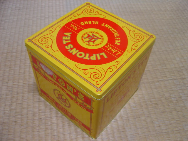 何だろうとしゃがんで見ると、リプトンの紅茶缶でした。ただの缶じゃありません。2.26kg入るようなでっかい缶です。20センチ四方くらいでしょうか。