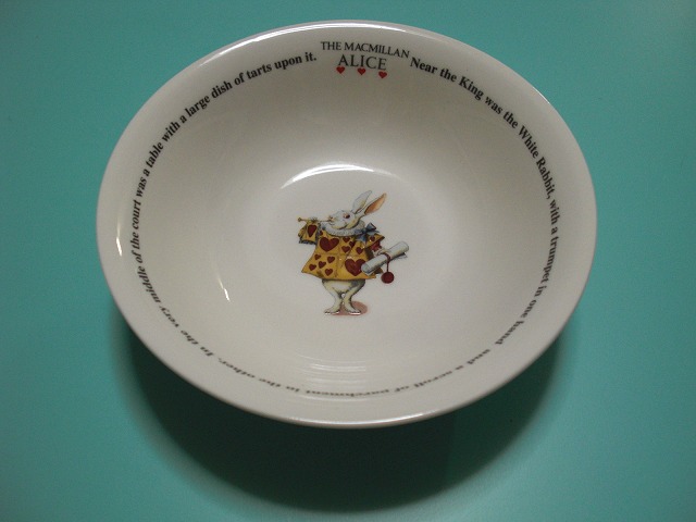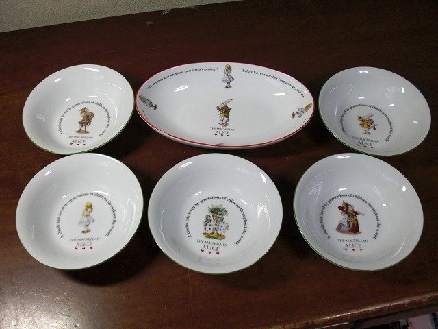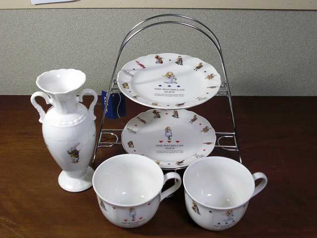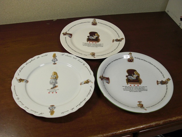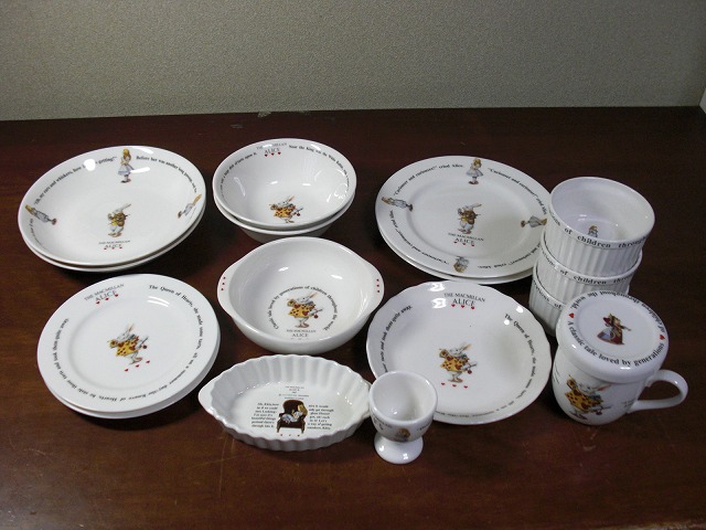 そそくさと中に入り、アリスの食器はないかと鋭い眼光で辺りを見回す。すると奥にアリスコーナー発見。楽天の前畑でも売っているシリーズでした。価格も楽天と変わらず、バラ売りもしていない模様。う~ん残念、と横を見ると旧シリーズのアリスが割引になってる!
