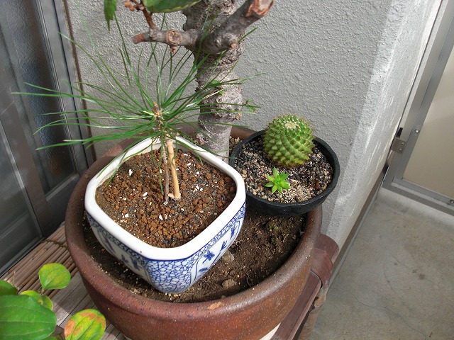 奥のベランダには樹齢もうすぐ2年の松と、それより数年長いサボテンちゃんが。松って小さい内から葉っぱだけは松らしいなあと思いつつ、これがどーやったら盆栽の松になるのか不思議です。