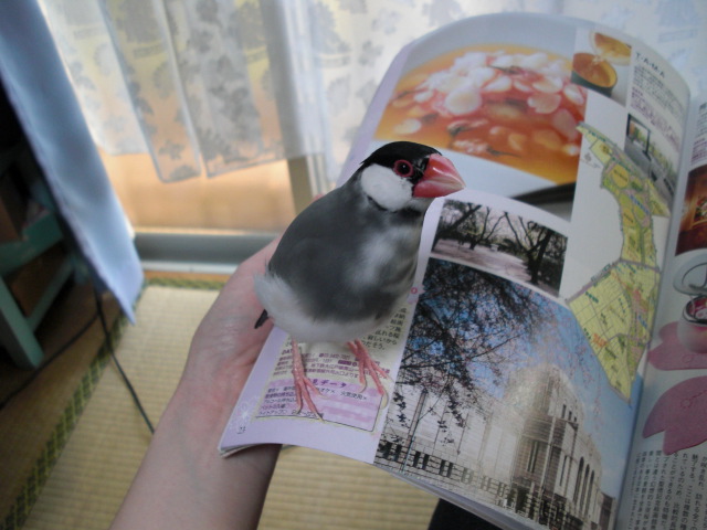 小松菜と共に粟も食べ、あとは室内で自由時間。僕が季節はずれにもお花見ガイドを見ていたら、興味津々で雑誌に載る文鳥。
