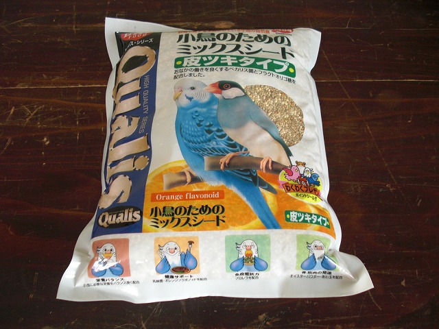 うちのエサはいつもコレです。250円くらいです。1羽飼いなら何ヶ月かもつと思う。