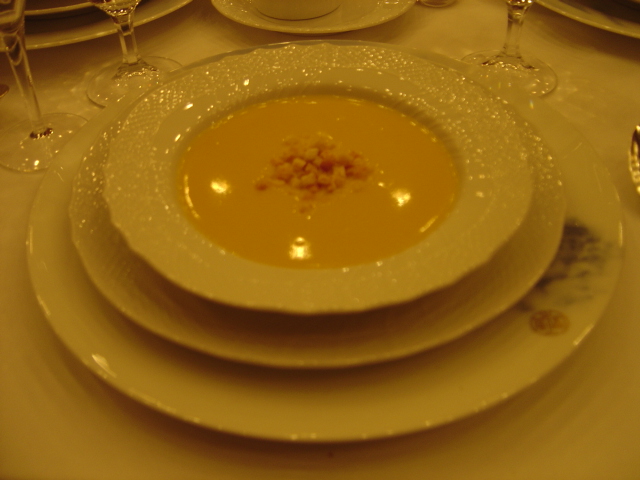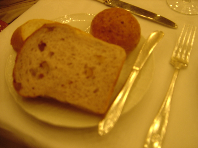 料理はコースでもう決まっているのですが、飲み物は別料金で頼めます。が、高い。ジュースでも600円くらいしている。シェリーは700円だけど、シャンパンは1850円とか、ボトルはもう万単位………