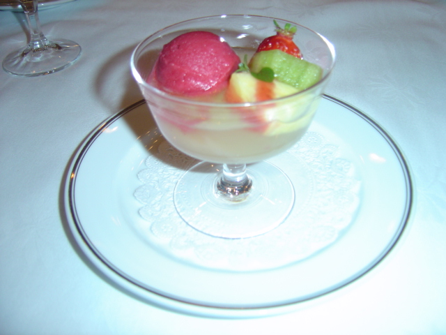 クランベリーのシャーベット甘すぎずに酸味があり、美味しい。果物も何種類もちょこちょこ乗っていて、見て楽しい一品。