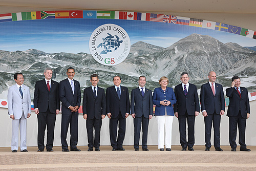 イタリアのラクイラで行われたサミットでは、恒例の首脳さん達の集合写真が撮影されました。ホスト国が中央で、あとは中央に近いほど重要度が高い国がくるらしいですが、予想通りと言うか我等が麻生首相は端っこでした。