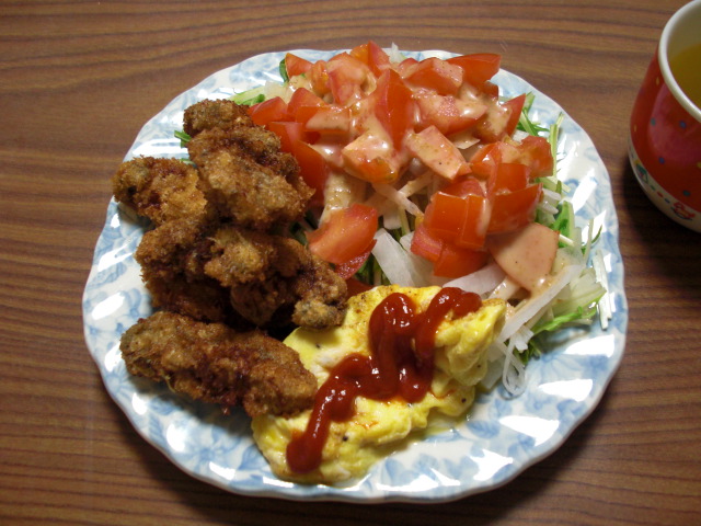 衣を付けるのに余った卵はオムレツにした。サラダのボリュームがちょっと多かったね。