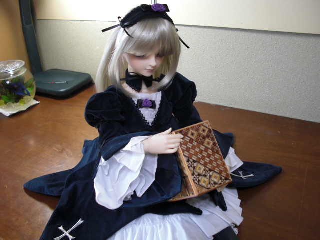 先々週の箱根旅行土産、寄木細工を鑑賞する銀様。